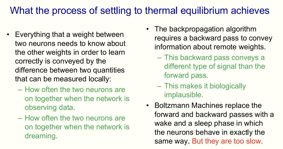「反向传播」算法依赖的是,前向通路传递神经元活动,反向通路传递敏感度;「玻尔兹曼机」仅通过对称连接性和相关性差异完成学习。然而,「玻尔兹曼机」的最大瓶颈是——速度。当权重较大时,达到热平衡极其缓慢,若是权重很小,这个过程才得以加速完成。