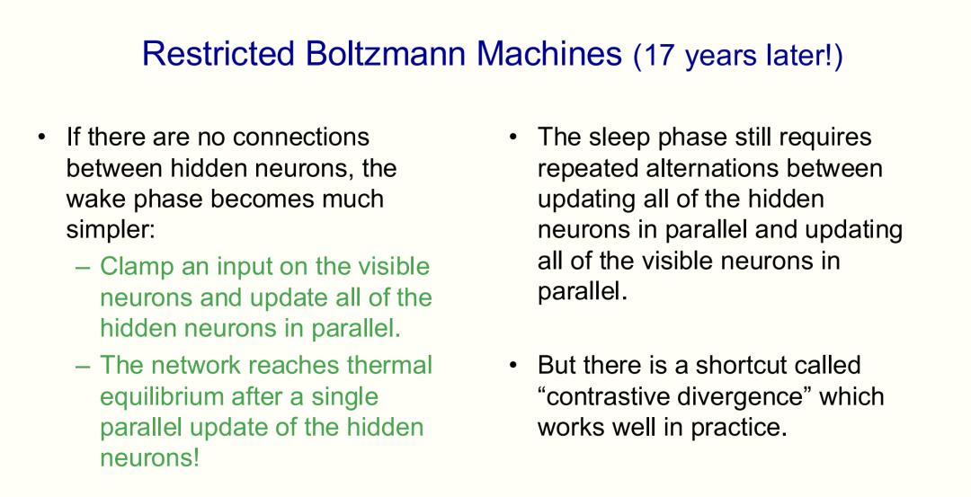 整整17年后,Hinton突然意识到,通过消除隐藏单元之间的连接来对「玻尔兹曼机」进行限制,就可以得到一个快得多的学习算法。由此,受限玻尔兹曼机(RBM)诞生了。