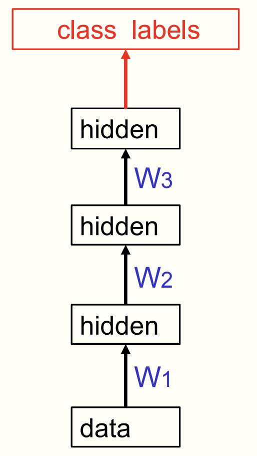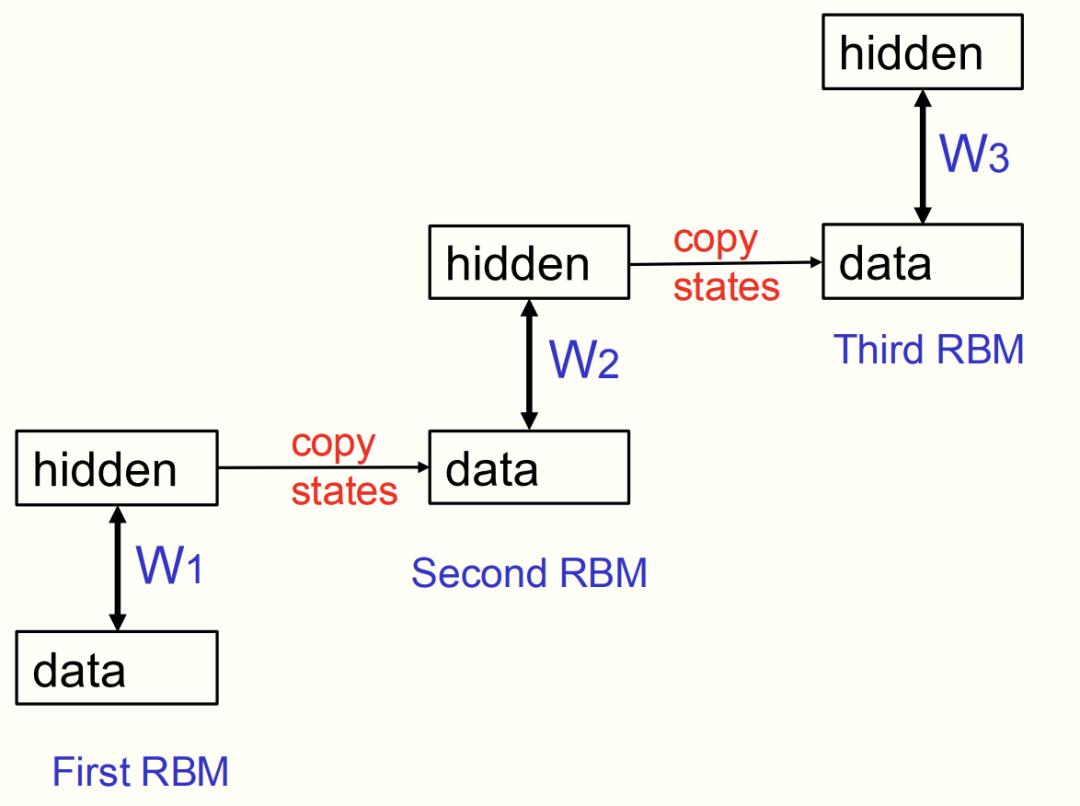- 将该RBM的隐藏层激活模式作为数据,用于训练下一个RBM。