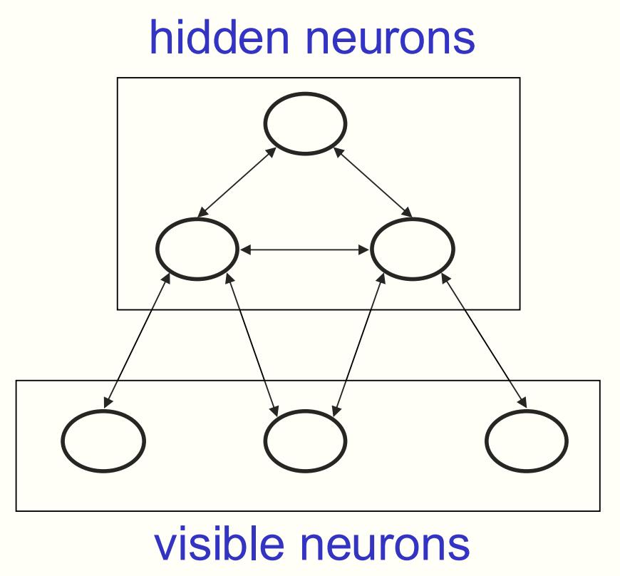 他们将网络分为了「可见神经元」和「隐藏神经元」。前者接收感官输入,比如一幅二进制图像;后者则用于构建对该感官输入的解释。网络的某个配置的能量,代表了该解释的劣度,他们想要的是一种低能量的解释。