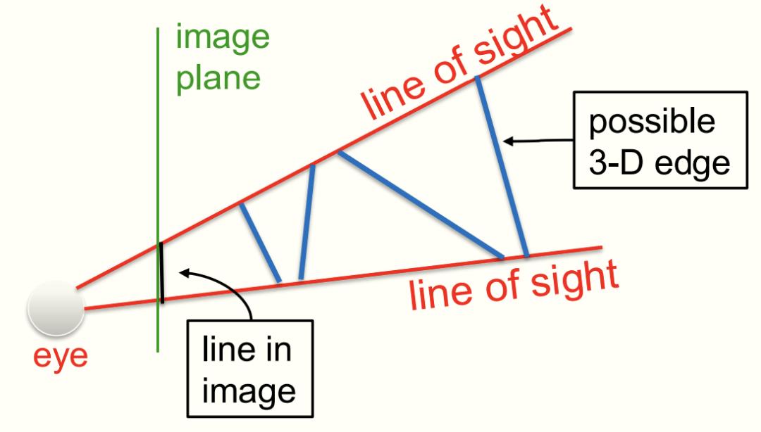 想象一下,你正透过一扇窗户看向外面的世界,然后在玻璃上,把看到的景物轮廓描绘出来。这时候,窗上的那条黑线,其实就是你画出来的一条边。而那两条红线呢,就是从你眼睛出发,穿过这条黑线两端的视线。