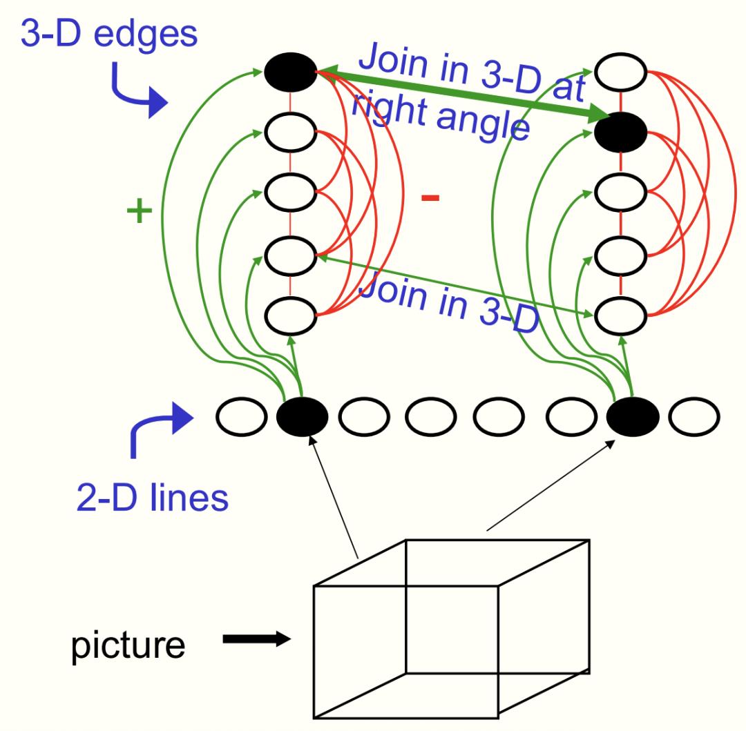 接下来,Hinton又将此方法应用于所有的神经元,问题是,应该激活哪些边缘神经元呢?人类在诠释图像时,都会遵循特定的原理。比如,两条线相交,假设它们在三维空间中,也在同一点相交,且深度相同。此外,大脑往往倾向于将物体视为直角相交。