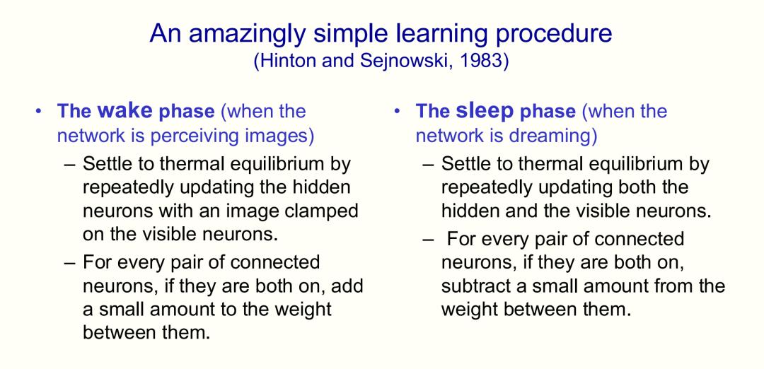 睡眠阶段:让网络自由「做梦」。所有神经元随机更新至热平衡。对同时开启的神经元对,减少连接权重。