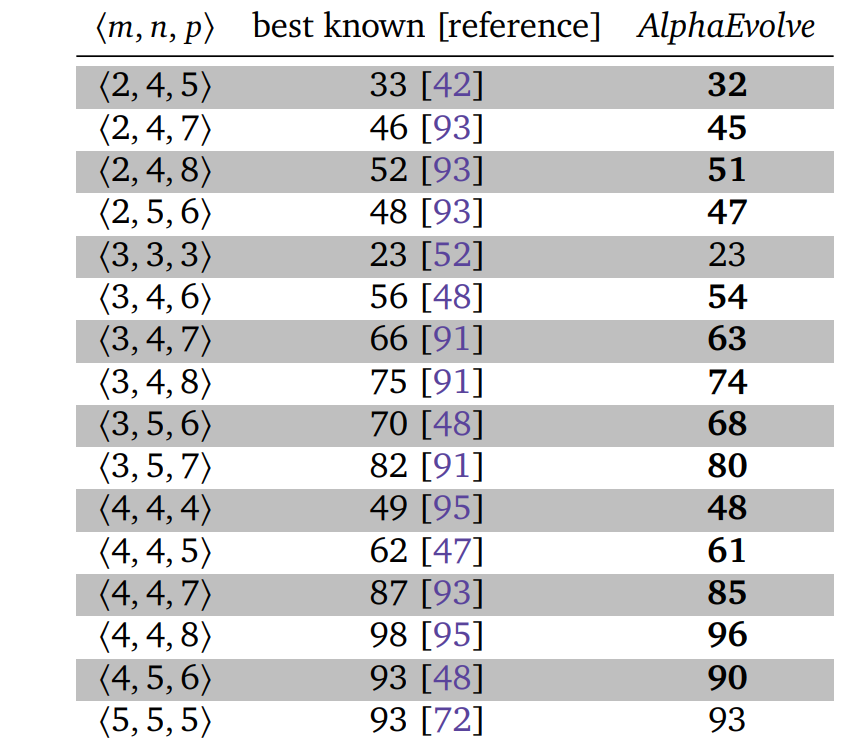 从上表中可以看出, AlphaEvolve 开发的各种算法提高了 14