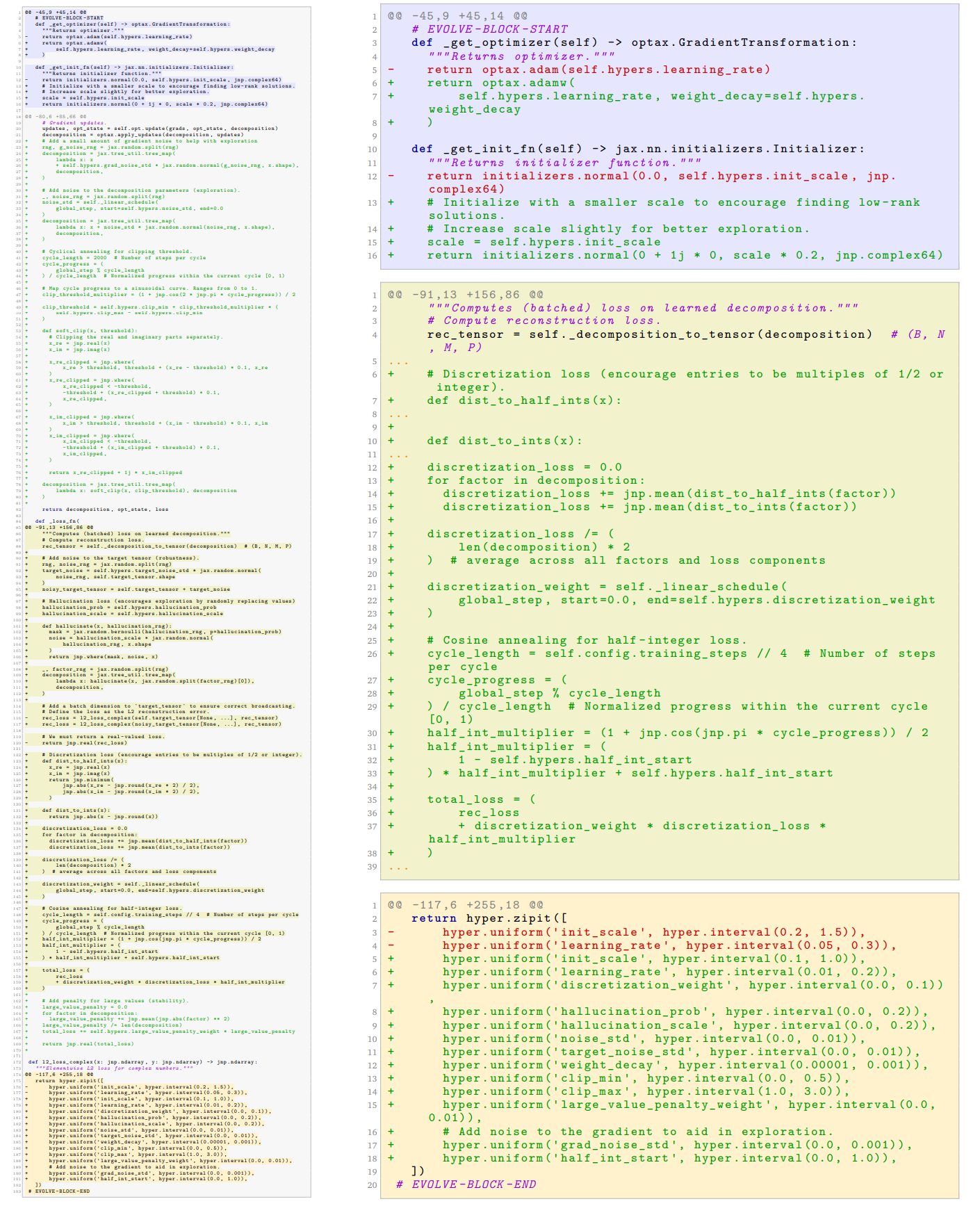 AlphaEvolve提出的发现更快矩阵乘法算法的变更。完整的差异概述在左侧并且右侧突出了一些摘录。在这个例子中,AlphaEvolve在多个组件上提出了广泛的变更,包括优化器及权重初始化(右上角)、损失函数(中间右方)和超参数扫描(右下角)。这些变更非常非同寻常,在进化过程中需要15次变异。