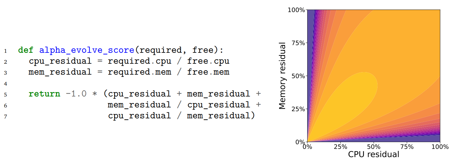 左图: AlphaEvolve 发现的启发式函数,针对 Google 的工作负载和容量进行了定制。右图:启发式评分函数的可视化。黄色区域代表高分,紫色区域代表低分。