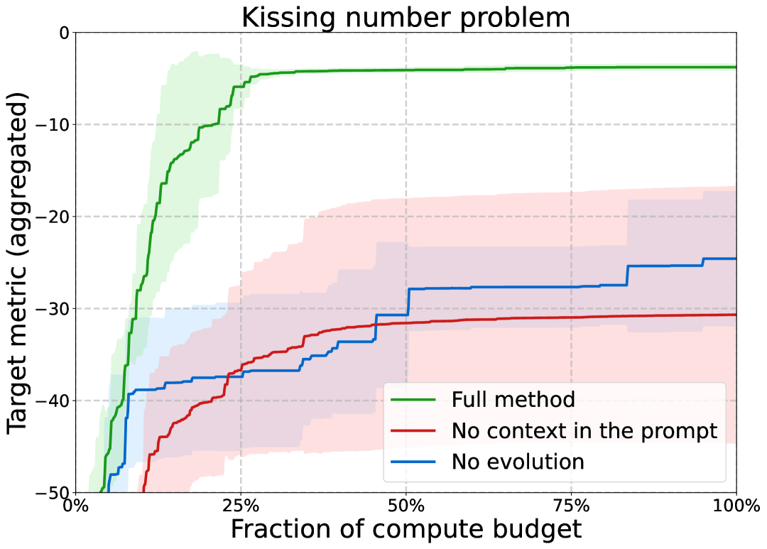 左图:AlphaEvolve 在寻找低秩张量分解以实现更快矩阵乘法的问题上的简化图。右图:AlphaEvolve 在寻找球体填充以提高接吻数的问题上的简化图。每条曲线显示了单个设置的性能,随着计算预算的增加,对所有考虑的目标取平均值(目标指标的值越高越好)。阴影表示目标内部标准差,对 AlphaEvolve 的三次独立运行取平均值,并使用不同的随机种子进行初始化。