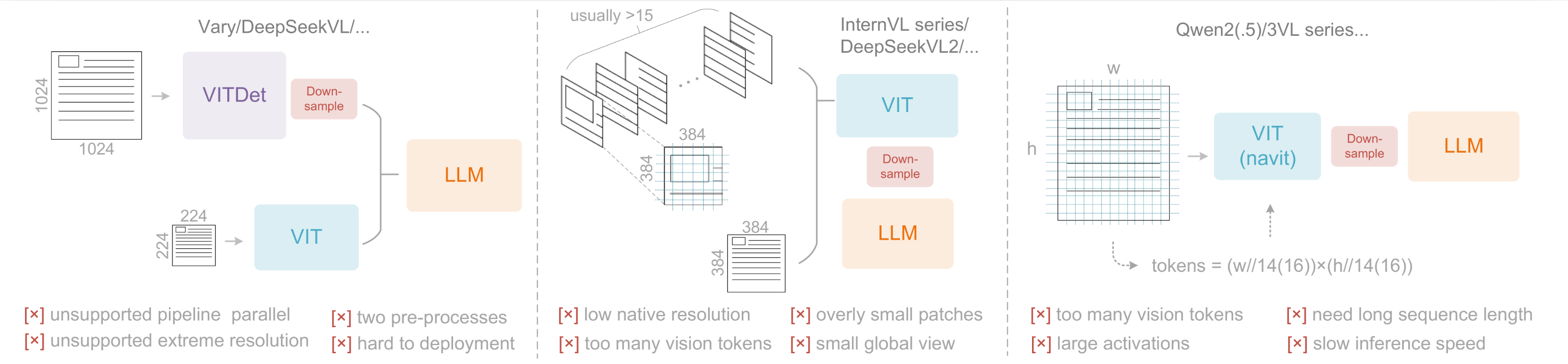 - 双塔架构(如Vary):需要双重图像预处理,部署复杂,训练时难以进行编码器管道并行