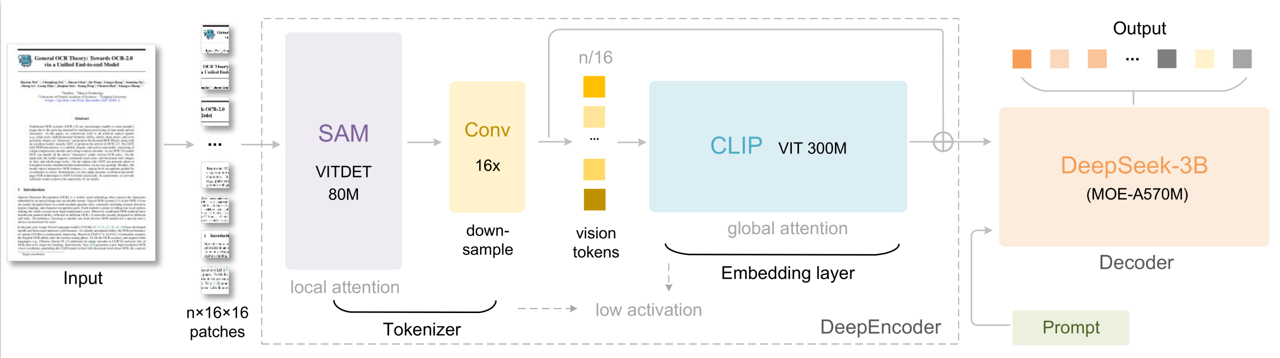 DeepEncoder架构:设计了一个新颖的视觉编码器,即使在高分辨率输入下也能保持低激活内存和最少视觉token。它通过16×卷积压缩器串联窗口注意力和全局注意力组件。