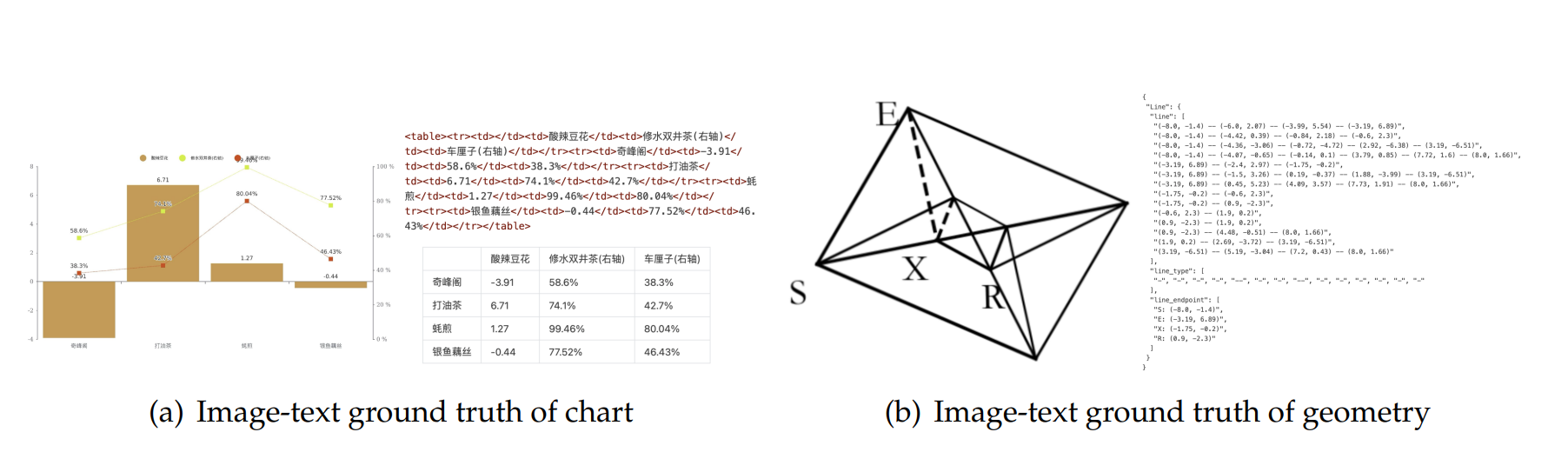 - 图表数据:参考 OneChart,使用 pyecharts 与 matplotlib 渲染 1000 万张图,主要涵盖折线、柱状、饼图与复合图。我们将图表解析定义为图像 → HTML 表格的转换任务(见图 (a))。