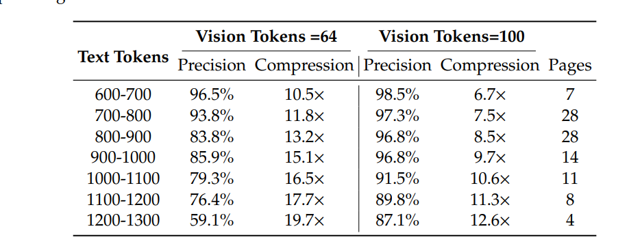 - 压缩比量化分析:在Fox基准测试上,模型在9-10倍文本压缩率下可达到96%+的OCR解码精度,10-12倍压缩率下约90%精度,20倍压缩率下仍有约60%精度。