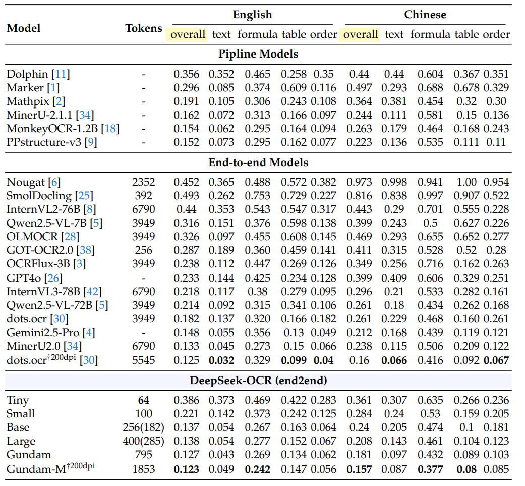 DeepSeek-OCR 不仅是实验模型,同时具备强实用性,可用于为 LLM/VLM 预训练构建数据。为量化 OCR 性能,我们在 OmniDocBench 上测试 DeepSeek-OCR,如下: